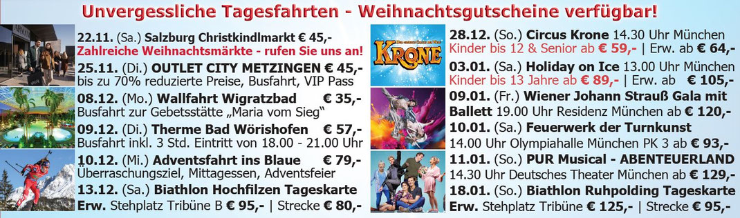 Liebe Freunde, Stammgäste, Neukunden und alle anderen Interessierten an unserem Reiseprogramm. Nehmen Sie sich Zeit beim Durchstöbern unserer Website und lassen Sie sich von unseren Angeboten und Reisezielen inspirieren. Wir freuen uns schon jetzt über Ihre telefonischen Anfragen und Buchungen und sind sicher, Sie bald in einem unserer Reisebusse begrüßen zu dürfen.