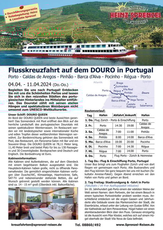 Diese Kreuzfahrt bieten wir als Gruppenreise an. Wie gewohnt ist eine Reisebegleitung von Heinz Sprenzel Reisen mit an Bord und steht während der Reise für Fragen zur Verfügung. Mit dem Bustransfer durch Heinz Sprenzel Reisen buchen Sie das Rundum-Sorglos-Paket. Sie können wohnortnah in den Bus einsteigen und werden im gewohnten Komfort und mit ausreichend Pausen nach Zürich zum Flughafen gefahren und fliegen mit uns gemeinsam nach Porto. Dort bringt Sie die Reisebegleitung zum Schiff und hilft beim Einchecken.