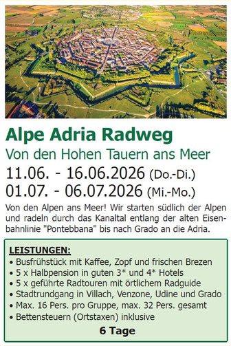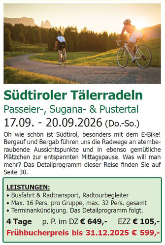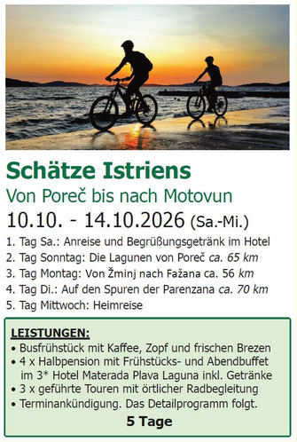 Leistungen: Busfrühstück mit Kaffee, Zopf und frischen Brezen, Begrüßung mit Sektempfang im Hotel, 3 x Übernachtung mit Halbpension im Hotel Jägerhof, 4 x geführte Touren mit örtlicher Radbegleitung, Max. 16 Pers. pro Gruppe, max. 32 Pers. gesamt