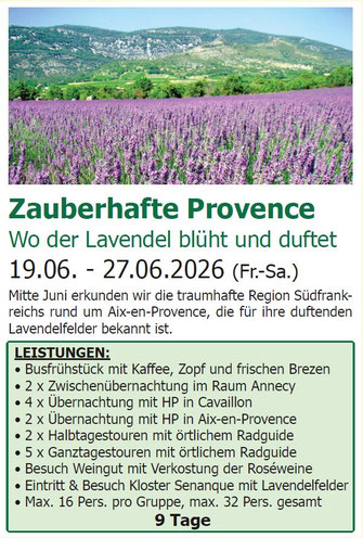 4 Tage p. P. im DZ € 649,- EZZ € 120,-